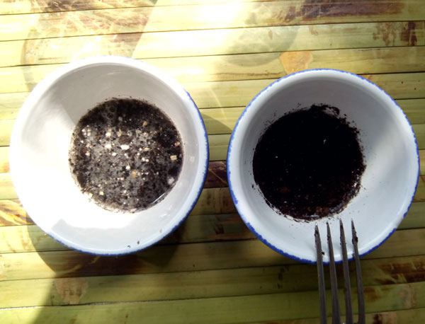 Pour réduire l’acidité du sol, il existe des méthodes éprouvées depuis longtemps, mais il sera difficile de réguler les quantités d’engrais à appliquer pour le terreau - chaux éteinte (chaux vive), tuf calcaire (chaux clé), farine de dolomie, poussière de ciment, gypse (chaux lacustre) ou un autre type de chaux. Cependant, l’option la plus accessible est la chaux finement broyée (chaux carbonatée). Je recommande de désacidifier le sol du jardin sur le rebord de la fenêtre avec de la cendre. J’ai écrit plus de détails dans un article . Une autre méthode pour réduire l’acidité est la coquille d’œuf .