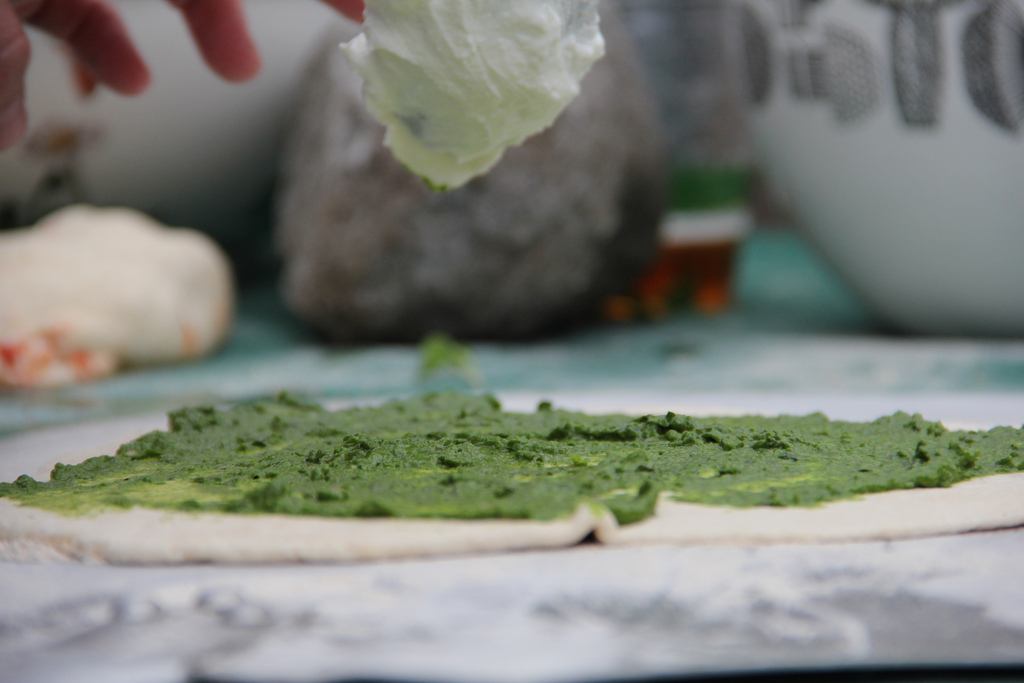 משרים את הסרפד במים רותחים ואחר כך שוטפים במים קרים. טוחנים את המרכיבים (חוץ מהגבינה) ומורחים על בצק פריך שפותחים בעדינות. מפזרים גבינה מעל ואופים עד שהבצק מוכן. מתאים במיוחד להגיש עם רוקט ובזיליקום.