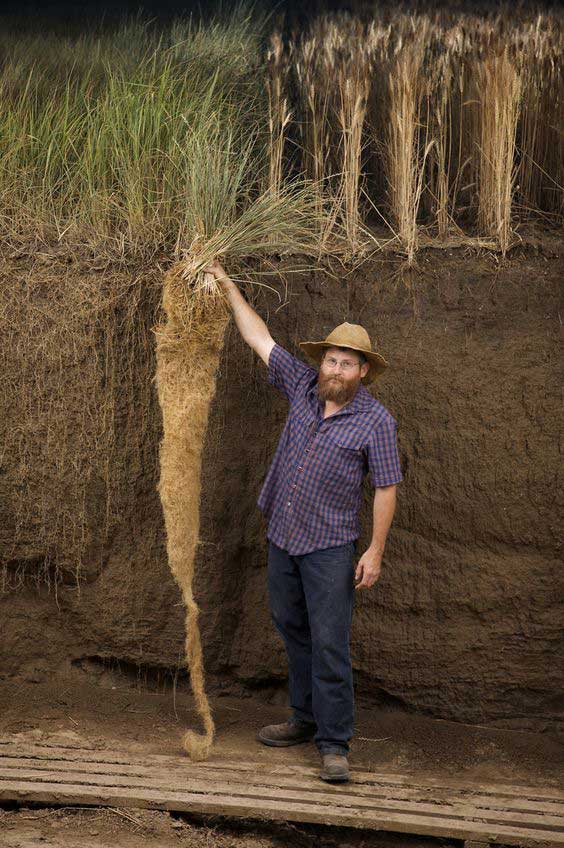 किसान के हाथ में बहुवर्षीय गेहूं की जड़ें।