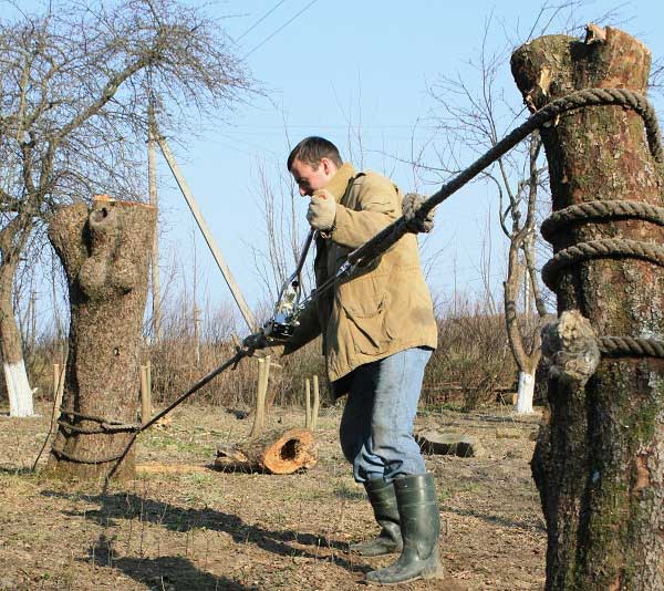 - A feszítőt, karokat vagy csöveket használva meg kell emelni a tuskót, és ki kell húzni a földből.
