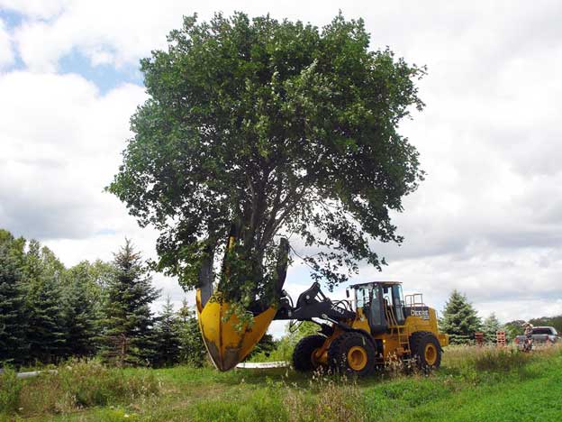 A fákat és tuskókat traktorral, bulldózerrel, rakodóexcavátorral - bármilyen nehézgéppel le lehet vágni a területen, feltéve, hogy ezek a gépek be tudnak hajtani a területre. Magas példányoknál (10 méter felett) a munka lépésről lépésre történik: levágják az oldalágakat, a koronát, a törzset darabokban. Ha a törés sugara alatt “tiszta mező” van, akkor előzetes előkészítés nélkül is megoldható. Ezt alpinizmusra specializálódott szakemberek végzik. A gépekkel végzett fák eltávolítása nem mindig a leggyorsabb, de a legdrágább módszer.