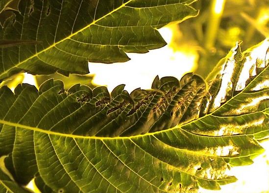 - 葉脈間の組織が死滅(壊死、骨格化)。