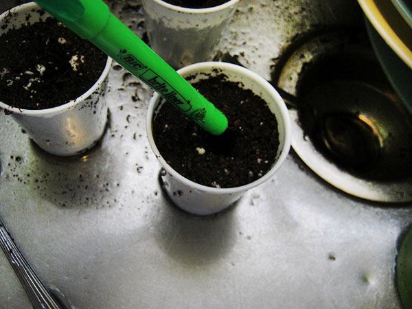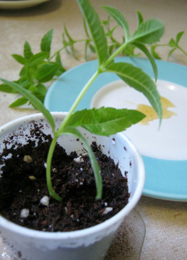写真は、バーベナの挿し木を蜂蜜で発根させた例です。理想的には切ったばかりの新鮮な挿し穂ですが、スーパーマーケットで購入した枝ですら根を出す可能性があります。新鮮な挿し穂を蜂蜜に浸します。しばらく前に切られた枝の場合は、1センチほど先端を切り戻してリフレッシュします。また、発根用の滅菌済みの培養土を準備します。例えば、排水穴が付いたプラスチックカップを使うと良いでしょう。