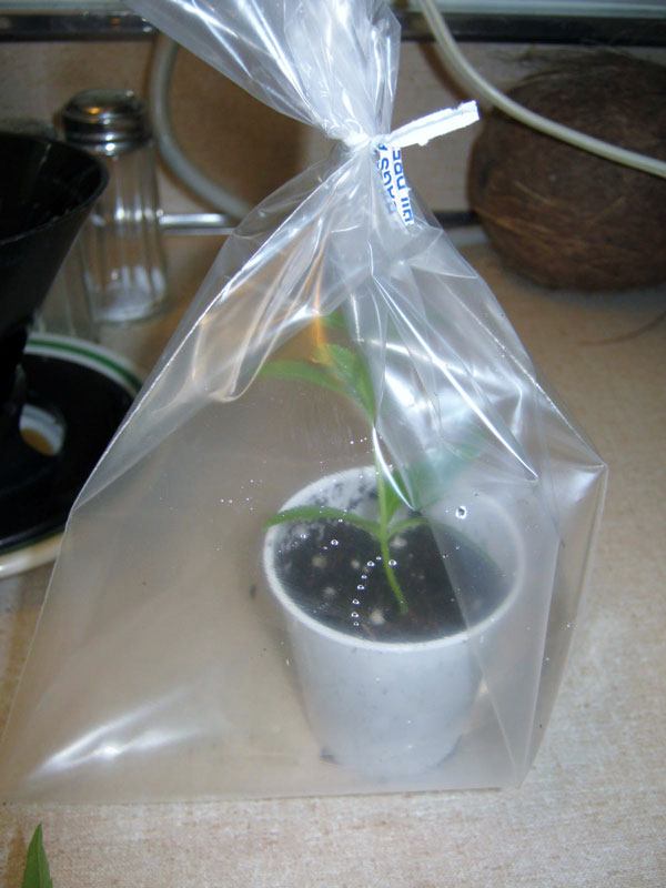挿し木を植えたカップを袋に入れ、温室のような環境を作り出します。そして、窓から離れた日陰の場所に置きます。発根にかかる時間は平均で約5~6週間です。袋は毎日数分間だけ開けて換気します。この温室環境にある間、植物への追加の水やりは必要ありません。もし土を湿らせる必要があると感じた場合は、スプレーボトルかティースプーン1杯程度にとどめてください。