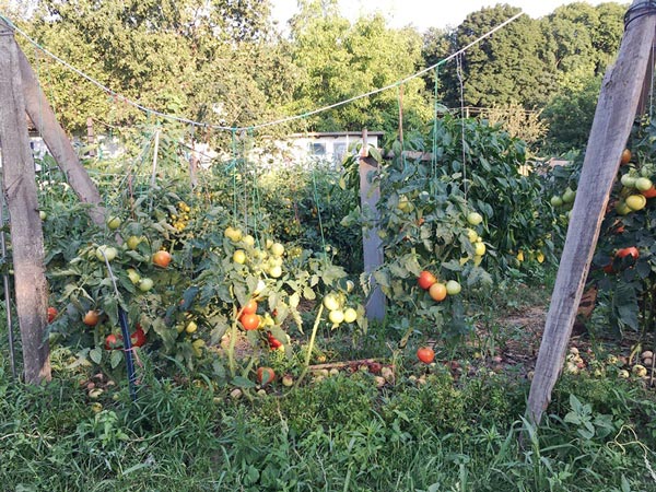올해는 고정된 밭 대신 자재를 이용한 아치형 구조를 사용했습니다. 정말 힘들었고, 무거운 토마토 덩굴들이 모든 지지대를 눕혔고, 알루미늄 파이프가 있는 밭 중 하나는 허리케인의 압력에 휘청거렸습니다. 다음 시즌에는 프로필 파이프를 지지대용으로 사용할 계획입니다.