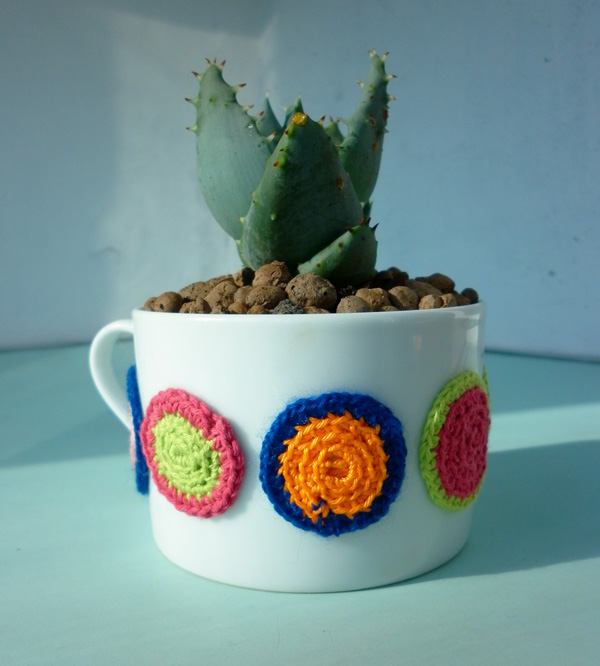 Iegādājos mazu Aloe Ferox – ideāls eksemplārs stādīšanai tasītē. Balto kafijas tasi izrotāju ar tamborētiem apļiem un pielīmēju ar gumijas līmi. Darbs izdevās stundas laikā, un rezultāts ir ļoti jauks un, galvenais, bezmaksas. 😊