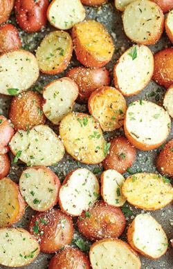 Nomazgājam kartupeļus un sagriežam lielās daļās. Vāram sālsūdenī 2 minūtes un izskalojam. Sajaucam augu eļļu un sviestu, nedaudz uzsildām, pievienojam garšvielas un ķiploku. Kartupeļus izkārtojam cepamajā traukā, pārlej ar aromātisko eļļu. Cepam tik ilgi, cik nepieciešams jūsu kartupeļu šķirnei. Recepte ir vienkārša, bet ļoti garšīga. Mīlu, kad 10 minūtes pirms kartupeļu vārīšanas pievienoju uz cepešpannas ziedkāpostu - tas paliek kraukšķīgs, bet nav neapstrādāts, pamēģiniet!