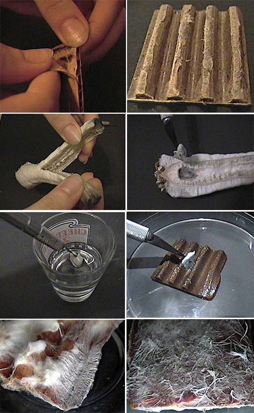 - Kertas karton diperbuat daripada kayu (selulosa), oleh itu bahan ini sudah dikenali oleh miselium yang asalnya ditanam pada serutan kayu dan keratan kayu. Proses penjajahan akan berlaku dengan cepat dan efisien.