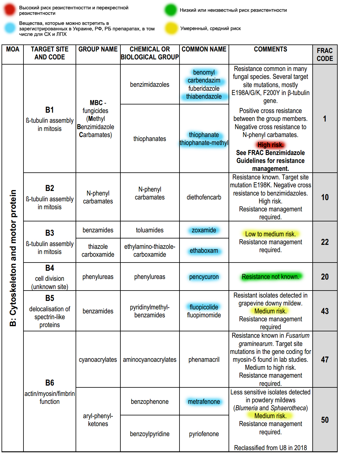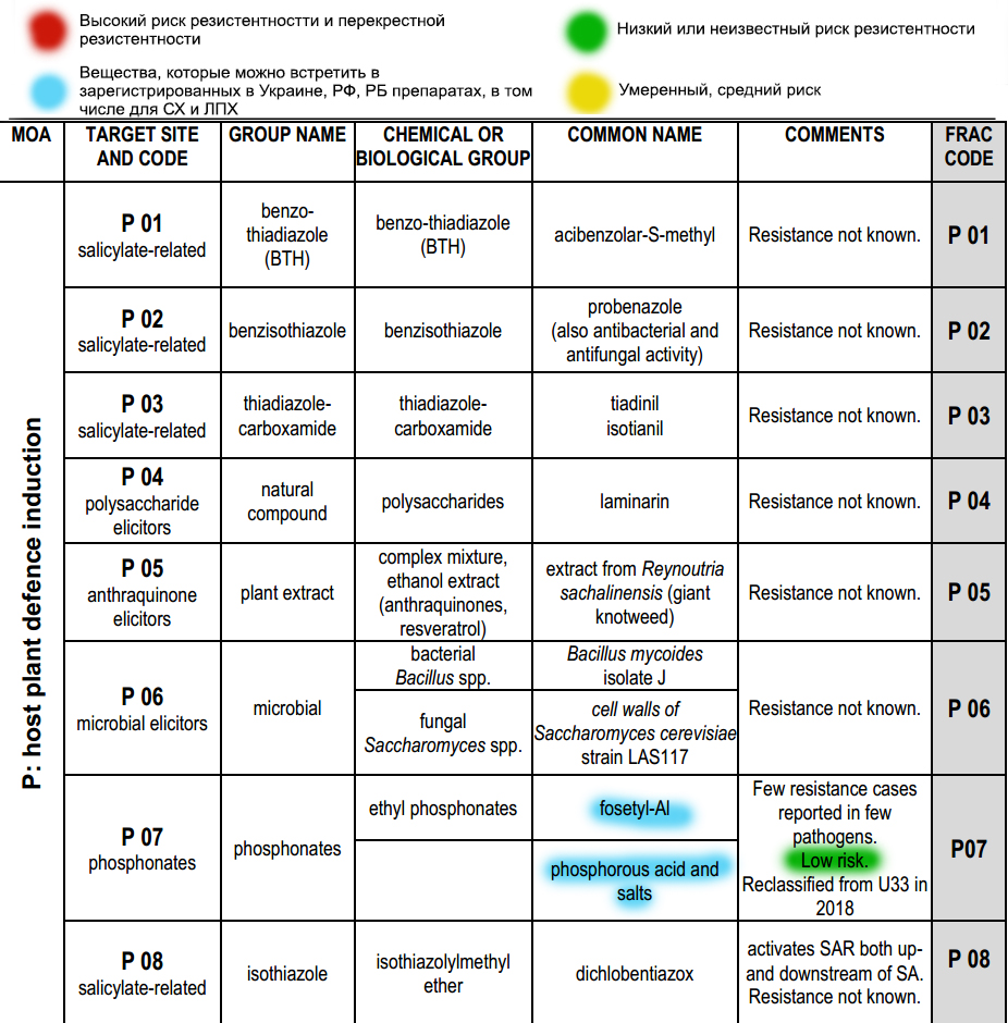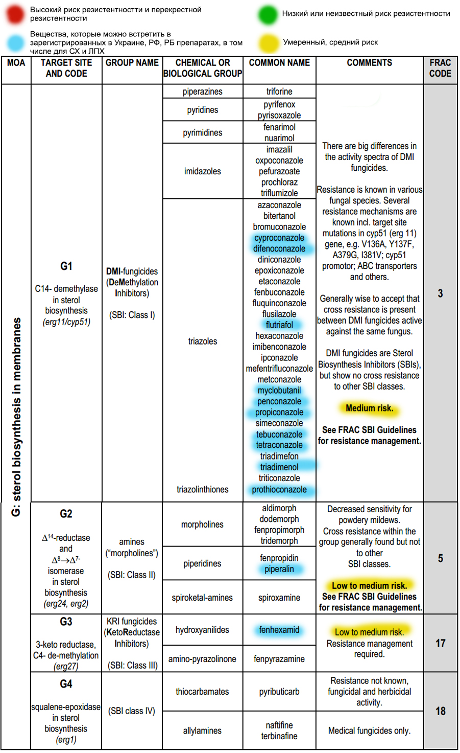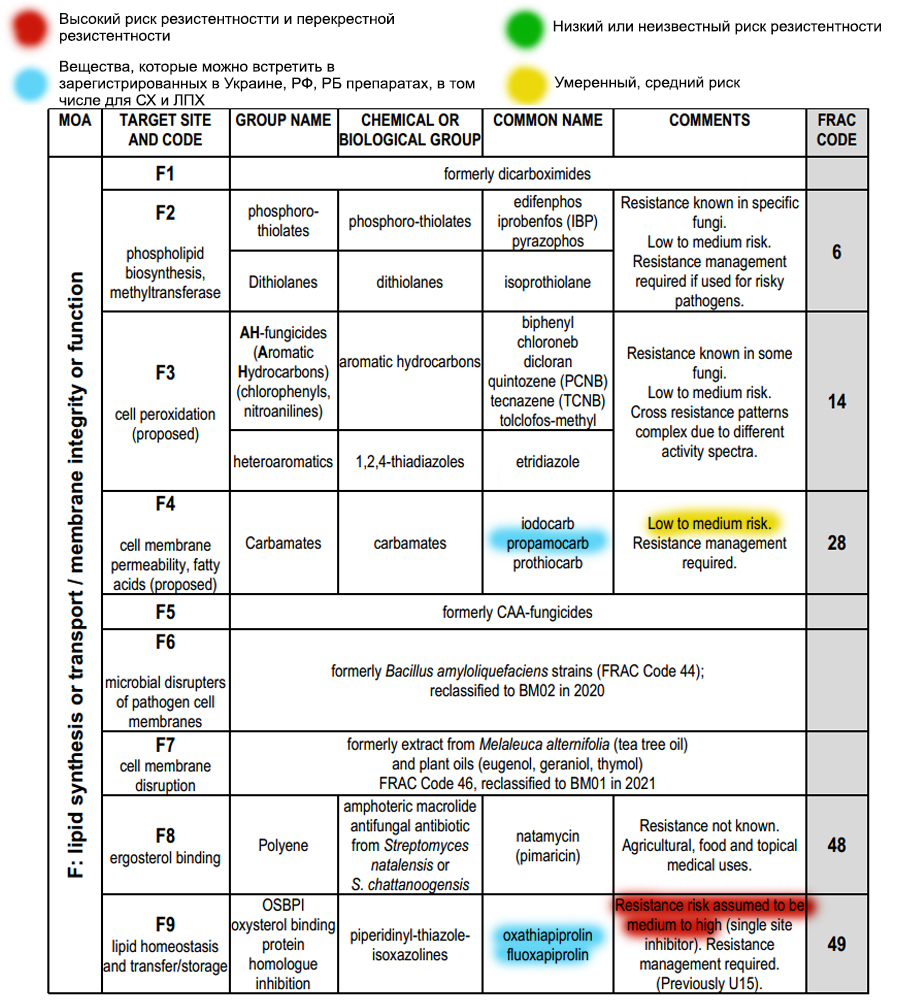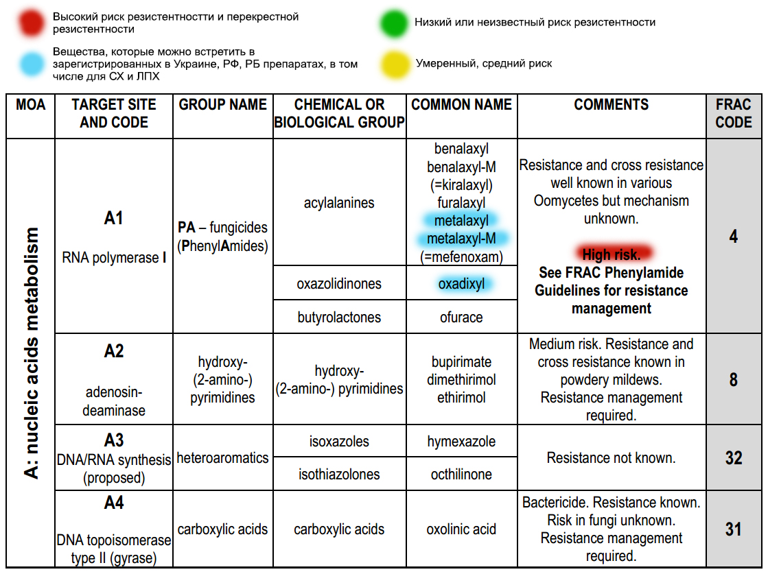 De Internationale Commissie voor het Bestrijden van Resistentie FRAC heeft een systeem van letter- en cijfercodes ontwikkeld die aan pesticiden worden toegekend op basis van verschillende parameters: indeling in groepen op basis van de werking van de stof op de ziekte, chemische oorsprong, naam van de stof en een code voor kruisresistentie.