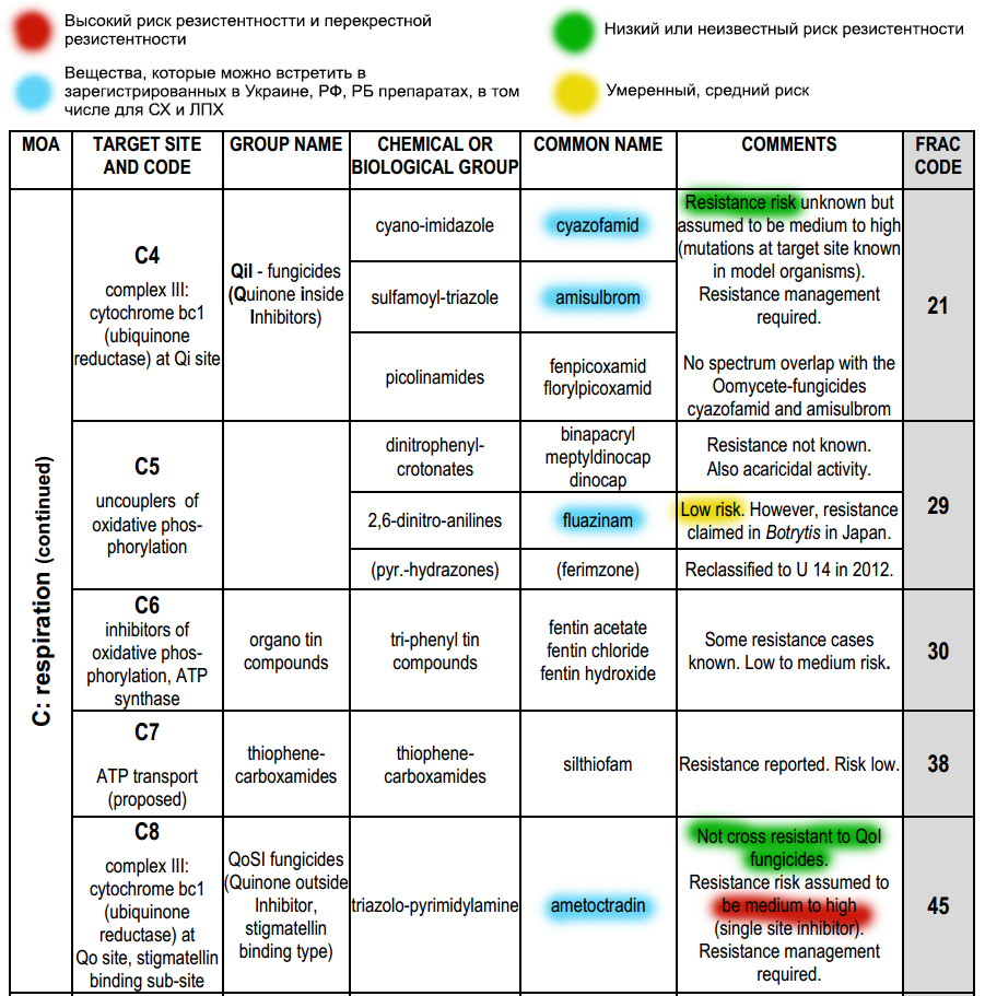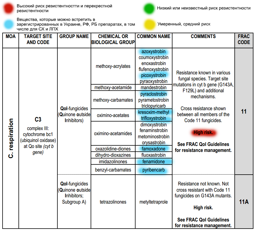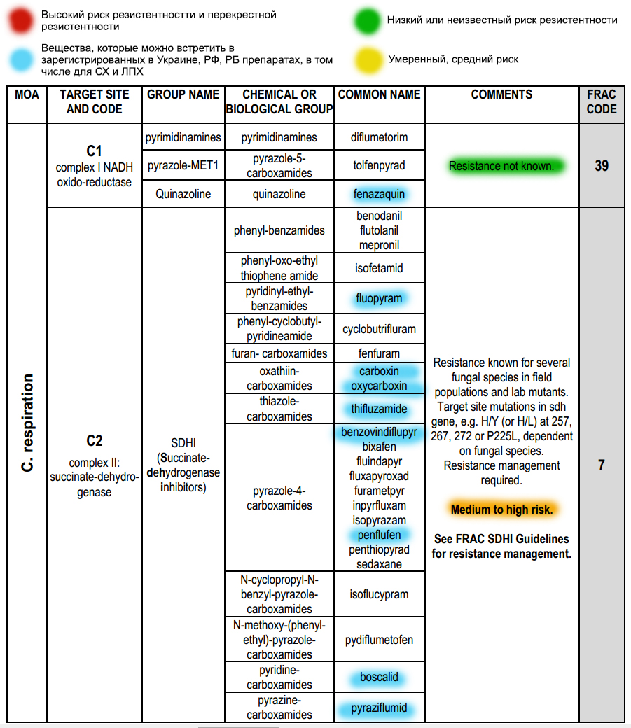 Bijvoorbeeld, groep C zijn remmers van cellulair ademhalingsproces. Hierin zitten pyrimidinaminen, quinolzolin, strobilurinen en anderen. De stoffen in deze groep hebben codes toegewezen gekregen: 39, 7, 11, 11A en anderen. Azoxystrobin uit Quadris ziet er volgens de FRAC-code zo uit: C3/11, waarbij C3 een subgroep is op basis van de doelstelling op de pathogeen (C3 complex III: cytochroom bc1 (ubiquinol oxidase) bij Qo site (cyt bgene)), 11 is de code voor kruisresistentie. Onder code 11 en subgroep C3 vinden we nog een populair middel: Strobi (krezoxim-methyl).