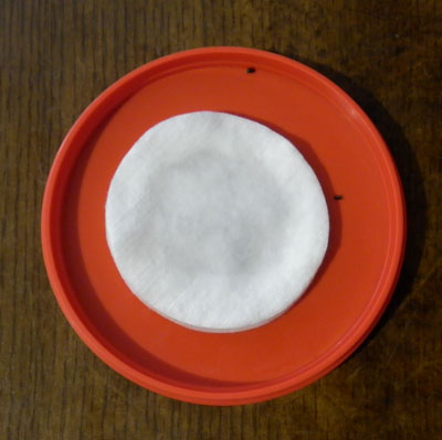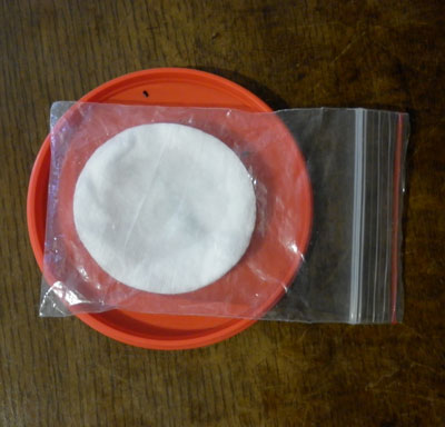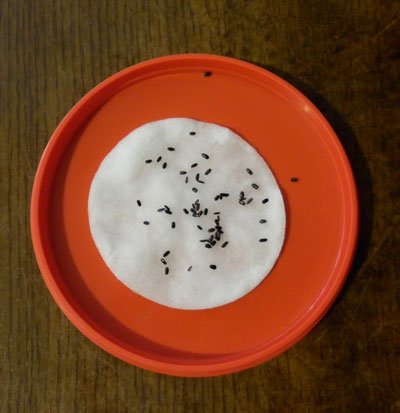 Lavendel heeft kleine zaden, die kun je niet met zand mengen. Ik heb de ervaring van ervaren tuinders gevolgd: ik nam een zip-lok zakje en veegde het van binnenuit met waterstofperoxide schoon. Ik heb de zaden niet behandeld - ik had niets en de ervaring van het zaaien vorig jaar, waarbij ik alle regels negeerde, was succesvol. Ik denk dat het deze keer ook goed zal komen. Vervolgens sprayde ik twee watten schijfjes met gefilterd gekookt water, verdeelde een dozijn zaden op een van hen en bedekte het met de andere.