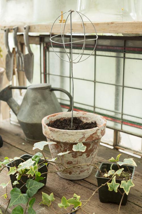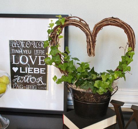 - Rammen kan pyntes med jute, hampetau eller bark. Denne dekoren gir ekstra volum til konstruksjonen, og plantens skudd får noe å gripe tak i. Slyng eføyens skudd rundt rammen noen ganger.