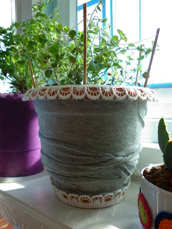 Pomysł na ozdobienie doniczki dzianiną nie jest nowy, można to nazwać decoupage’em. U mnie wyszło tak. Wszystko jest bardzo proste. Z starego T-shirta odcina się kawałek i dowolnie owinąć nudną doniczkę, okresowo przymocowując materiał gumowym klejem. Krawędź i podstawkę obkleiłam koronką ze starych szkolnych kołnierzyków. Przesadzając roślinkę, owinęłam doniczkę folią, żeby nie pobrudzić ziemią.