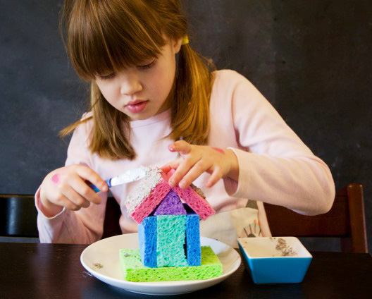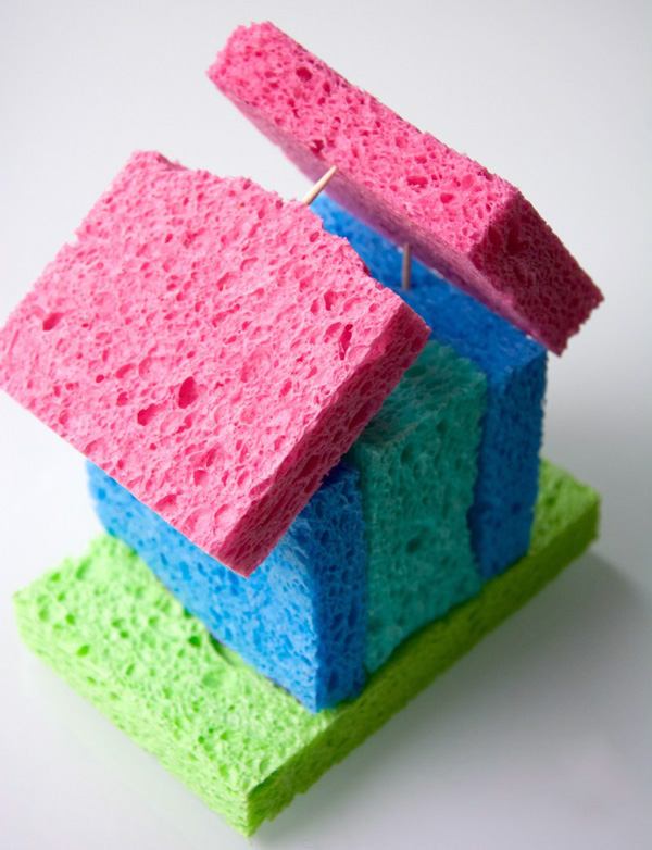 Do dachu domków możesz dodać wody do nasion i pozwolić im napęcznieć – powstanie lepki “pasta” z nasion, która już nigdzie nie ucieknie z gąbki.