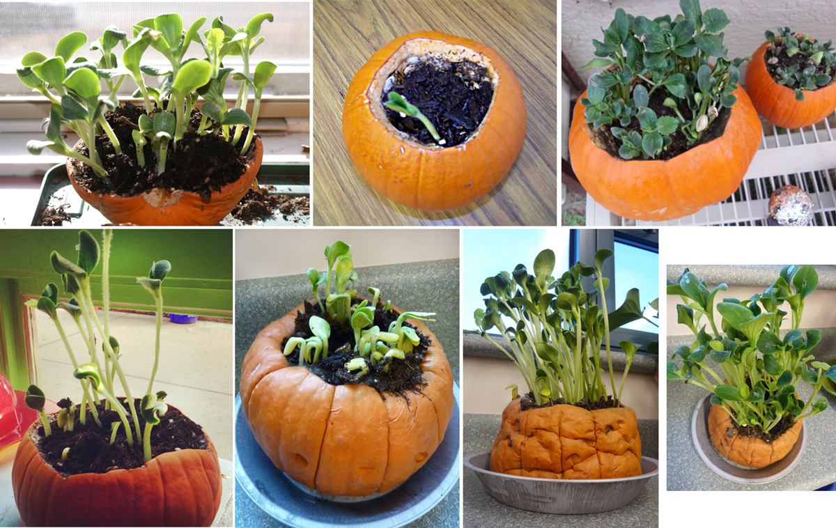 Ten eksperyment nie przebiega tak szybko, jak z fasolą i nasionami sałaty, ale powinien przypaść do gustu dzieciom w wieku przedszkolnym i młodszym uczniom. Należy wybrać mocną małą dynię i zostawić część jej nasion. Napełnij dynię ziemią, posadź kilka nasion i podlej. Autor projektu twierdzi, że w procesie gnicia dynia nie wydziela zapachu, ale dostarcza roślinom dużo składników odżywczych.