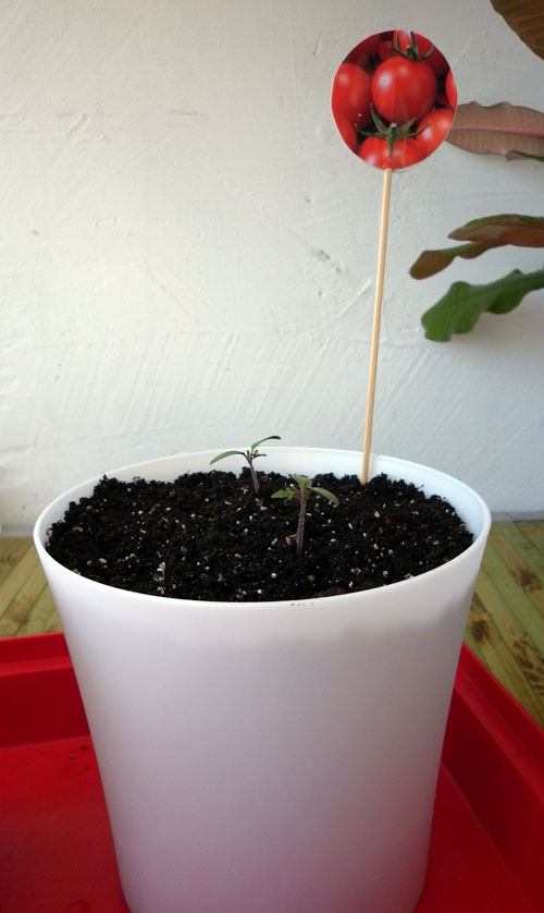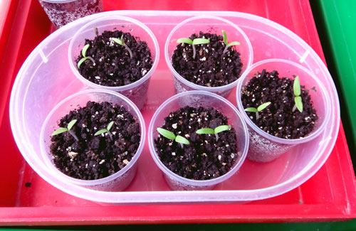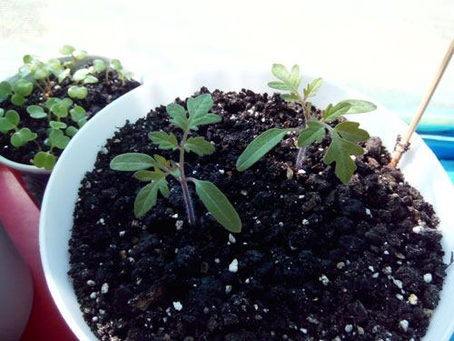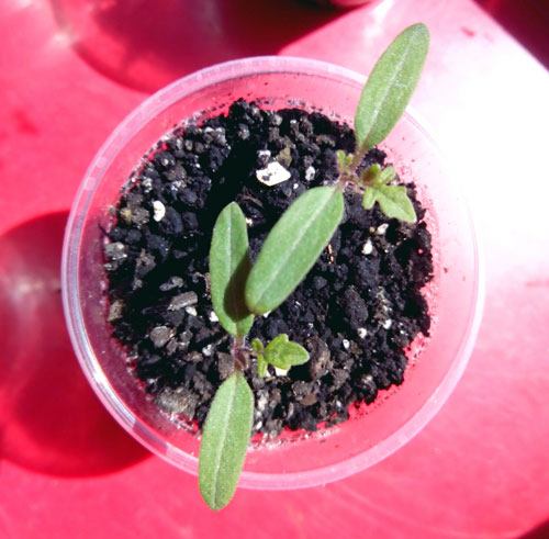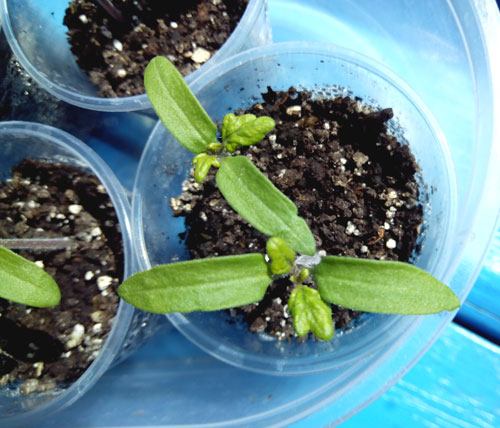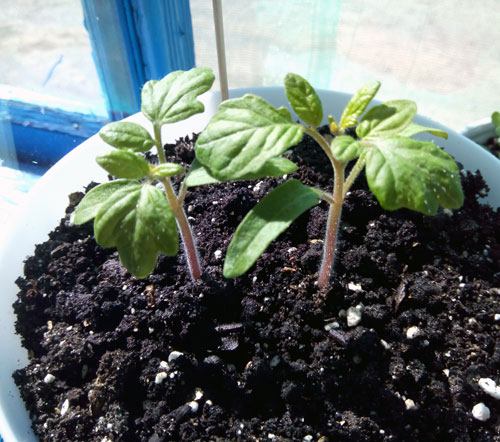 - As primeiras folhas verdadeiras nos tomates vermelhos. As mudas não estão alongadas, tudo indica que estão recebendo luz e nutrientes suficientes. Podemos replantá-las em vasos.