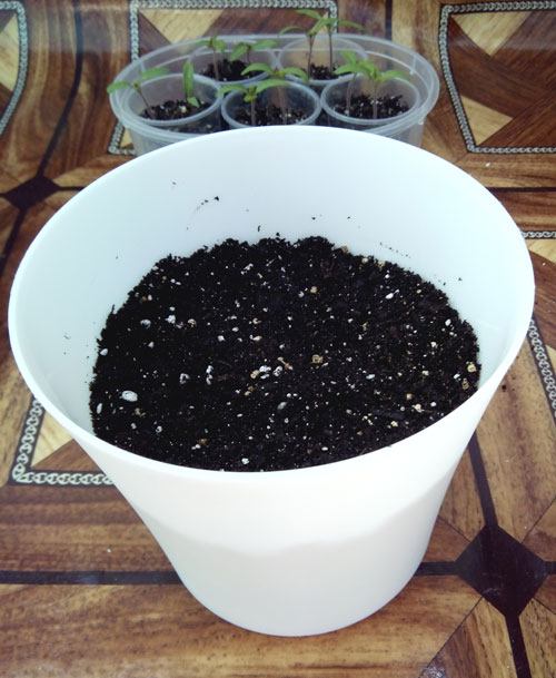 - Tenho vasos de 2 L. Provavelmente, esse volume será insuficiente para o sistema radicular dessas variedades de tomates e terei que replantá-las antes de decidirem florescer. Além disso, fiquei com pena das belezuras e decidi colocar duas em cada vaso. Os vasos devem ter furos para drenagem, com 3 cm de dreno (pedrisco).