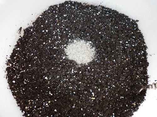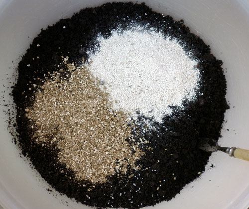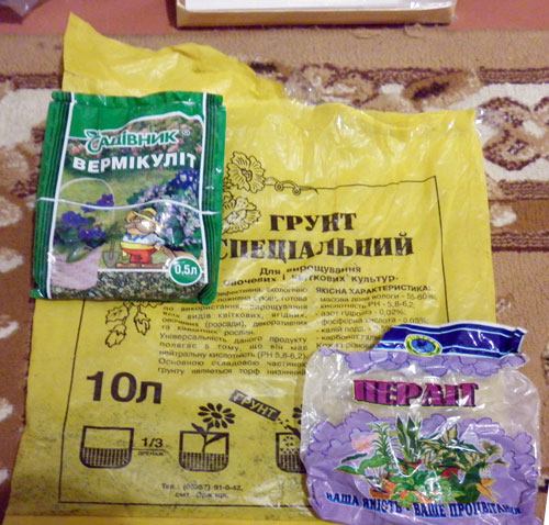 5. Componentes para a mistura de solo: solo pronto substrato à base de turfa e húmus, perlite e vermiculite . O solo foi previamente assado em uma panela velha no forno por cerca de 2 horas. Como desinfetar o solo escrevi aqui .