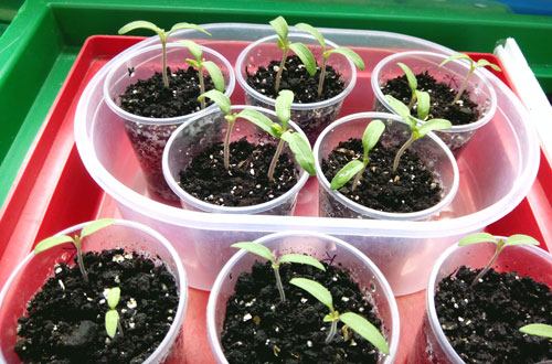 10. Furei copinhos de 100 g, os enchi com solo. Coloquei 2 sementes por copinho, pressionando-as levemente no solo, a 3-5 mm. Umedeço a superfície com um borrifador. Marquei os copinhos com a letra da variedade. É conveniente quando todos os copinhos estão em um único prato, para que possam ser girados ao mesmo tempo em direção ao sol.