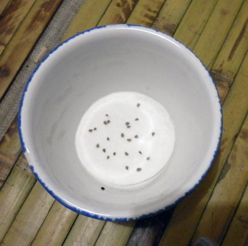 4. Umedeçi outro disco de algodão e cobri as sementes. Um ambiente úmido permite que as sementes acordem e incham um pouco. Um dia é suficiente, mas consegui 2 dias. Não umedeci mais. Não tratei com permanganato, pois não consegui comprá-lo na farmácia.