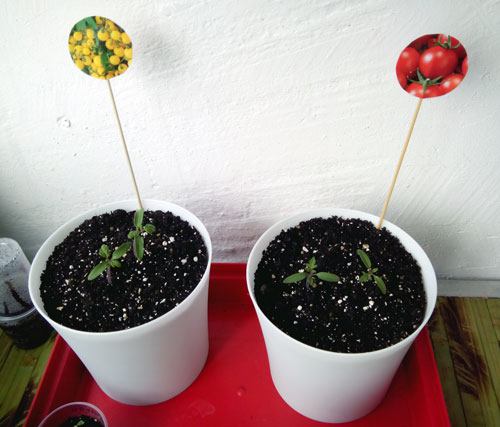- Identifiquei as variedades nos vasos com imagens recortadas dos pacotes de sementes.