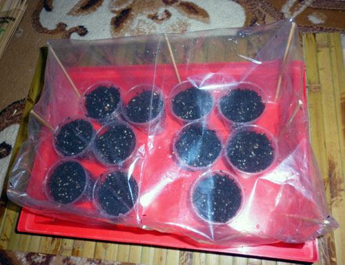 11. Montei rapidamente uma estufinha com um saco, palitos de bambu e fita adesiva. Sob a película coloquei as sementes de tomilho, só para companhia :). As mudas ficam na estufa até os primeiros brotos - as folhinhas. A temperatura deve estar em torno de 18-20 graus, é desejável manter as mudas na sombra até que germinem. A estufa foi coberta à noite por mais alguns dias, dependendo do clima e confiando na intuição.