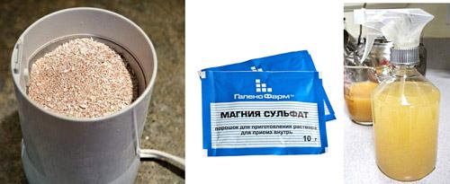 Скорлупа в кофемолке, сульфат магния и готовое удобрение (его цвет может варьироваться)