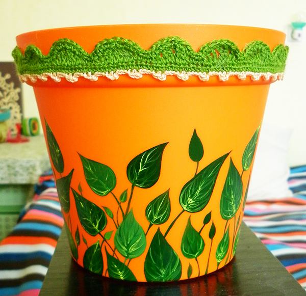 Pota ya plastiki yenye sahani ilikuwa na bei ya $1. Nina uzoefu wa kufanya kazi na rangi za mafuta, hivyo nilitumia hizo kwa kuchora pota - bila kupaka msingi, nilichora majani tu kwenye plastiki: