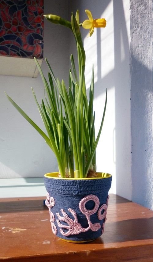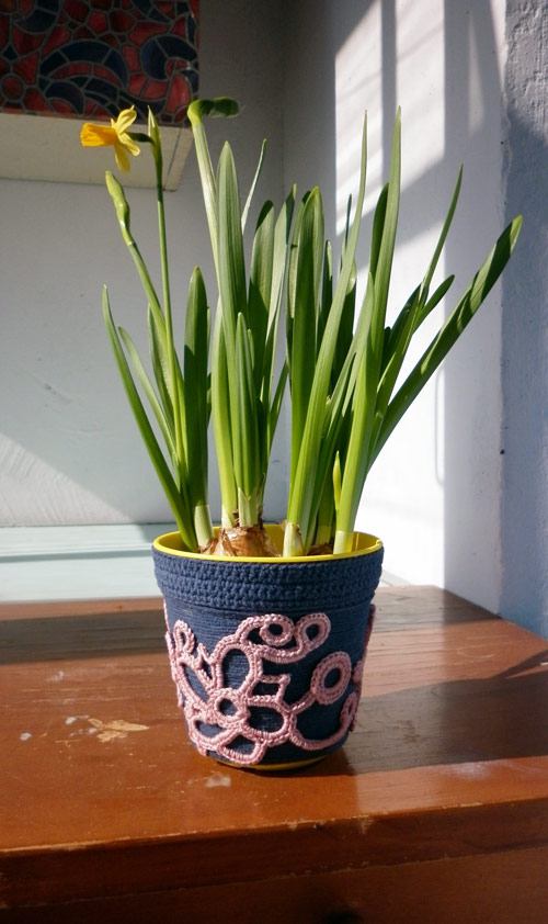 การตกแต่งกระถางดอกไม้ด้วยการถักโครเชต์เป็นอีกหนึ่งวิธีในการตกแต่งกระถางที่ดูธรรมดาให้มีความสวยงามมากขึ้น โดยให้ถักเป็นวงกลมรอบกระถางจำนวน 3 แถวด้วยลายโครเชต์แบบเสาคู่ (Double Crochet) ให้พอดีกับรอบกระถาง จากนั้น นำ “ขอบ” ที่ถักเสร็จแล้วมาติดกับกระถางโดยใช้กาวยางในกรณีที่กระถางทำจากพลาสติก และใช้กาว PVA หากกระถางเป็นดินเผา (ที่ไม่เคลือบเงา)