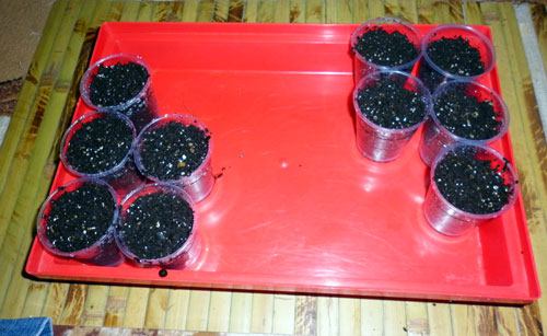 10. ในแก้วขนาด 100 กรัม ฉันเจาะรูและเติมดินลงไป หยอดเมล็ดลงไปแก้วละ 2 เมล็ด แล้วกลบเพียงเล็กน้อยให้ลึกประมาณ 3-5 มม. ฉีดพรมน้ำเบา ๆ และทำเครื่องหมายบนแก้วด้วยตัวอักษรที่บอกพันธุ์มะเขือเทศ การจัดแถวแก้วในถาดเดียวกันทำให้สะดวกต่อการหมุนไปทางแสงแดดพร้อมกัน