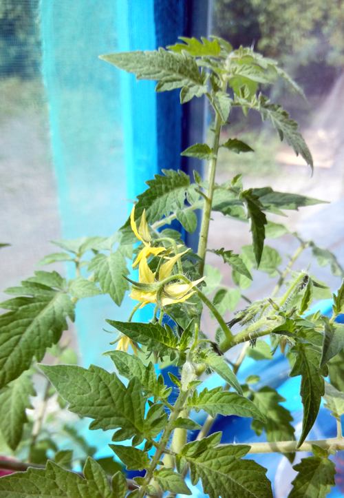 ต้นมะเขือเทศที่พักตัวในช่วงฤดูหนาวฟื้นตัวได้ดี และกำลังออกดอกเต็มที่